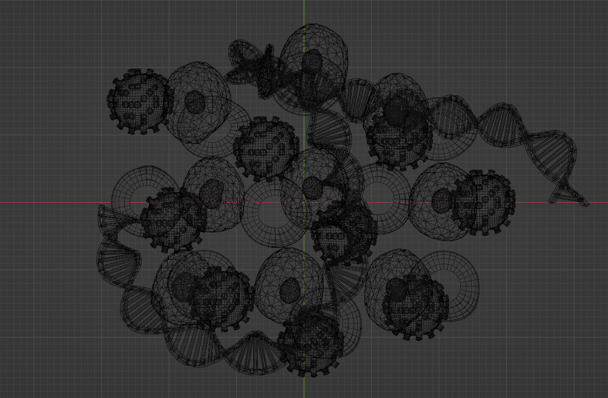 In der 3D-Software haben wir zunächst die Modelle gestaltet. Uns war von vornherein klar, dass von den Details am Ende nicht viel zu sehen sein wird. Das kam uns zugute – es reichte also, wenn wir relativ grob modellierten. Wir entschieden uns in enger Abstimmung mit den Expert:innen unserer Kundin für Viren, Blutzellen, Körperzellen und eine DNA-Helix – denn nichts ist peinlicher, als hier etwas völlig Falsches einzusetzen. Zum Einsatz kamen verschiedene Modelling-Techniken und wir haben hier und da ein paar Varianten des selben Objekts modelliert, um es etwas organischer zu halten.