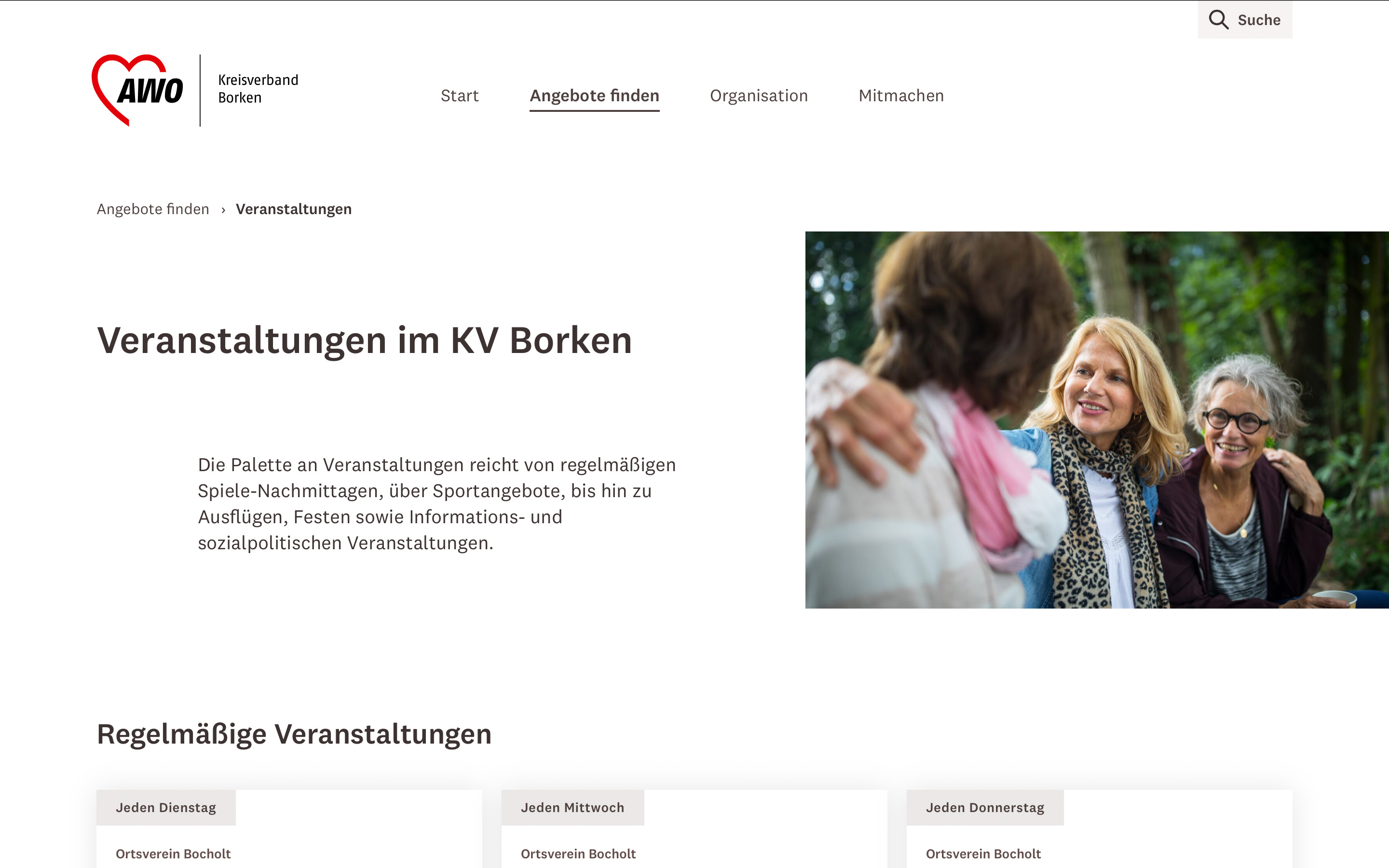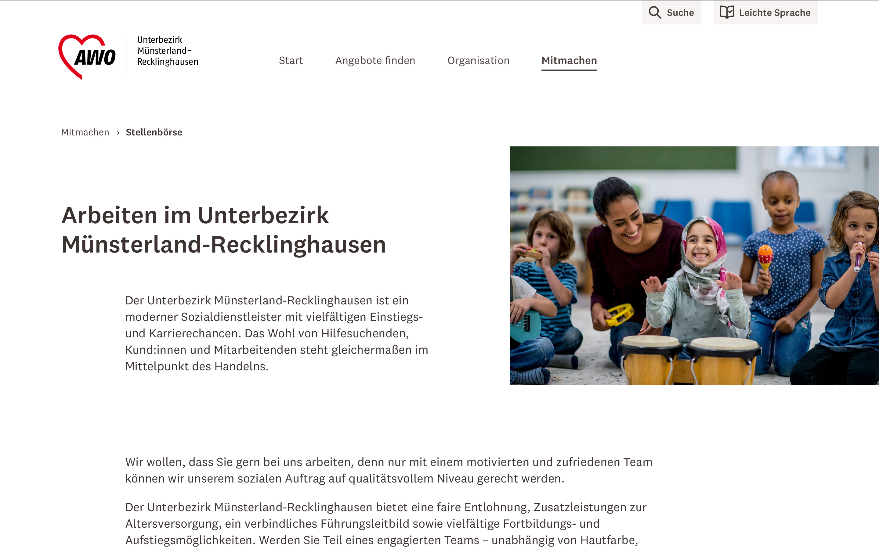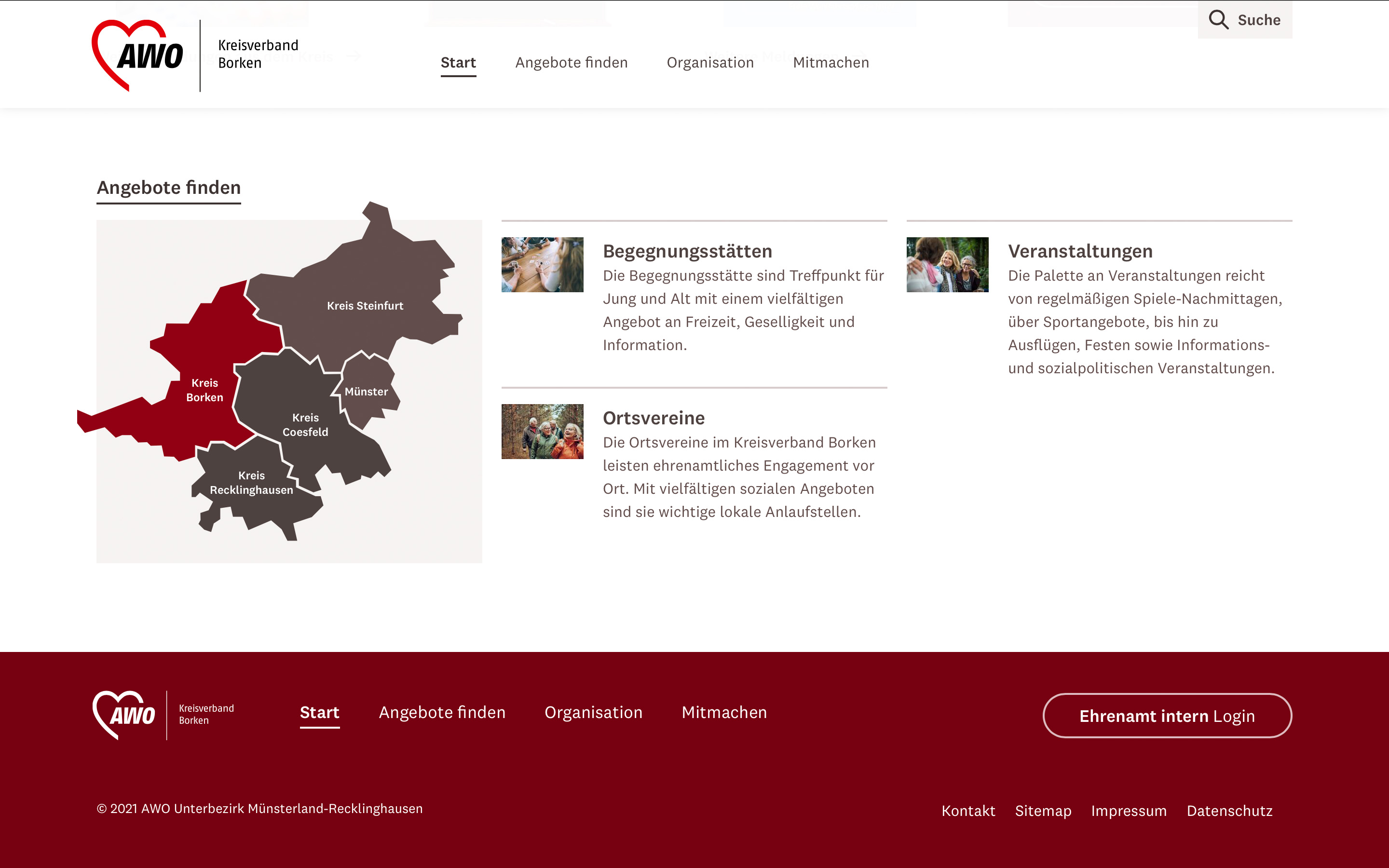 Die Arbeiterwohlfahrt – kurz AWO – zählt zu den Spitzenverbänden der freien Wohlfahrtspflege in Deutschland. Für den Unterbezirk Münsterland-Recklinghausen mit seinen über 400 Einrichtungen, fünf Kreisverbänden und zahlreichen haupt- und ehrenamtlichen Mitarbeitenden haben wir eine neue Website gestaltet und umgesetzt, die das Schaffen der AWO besser sichtbar macht.