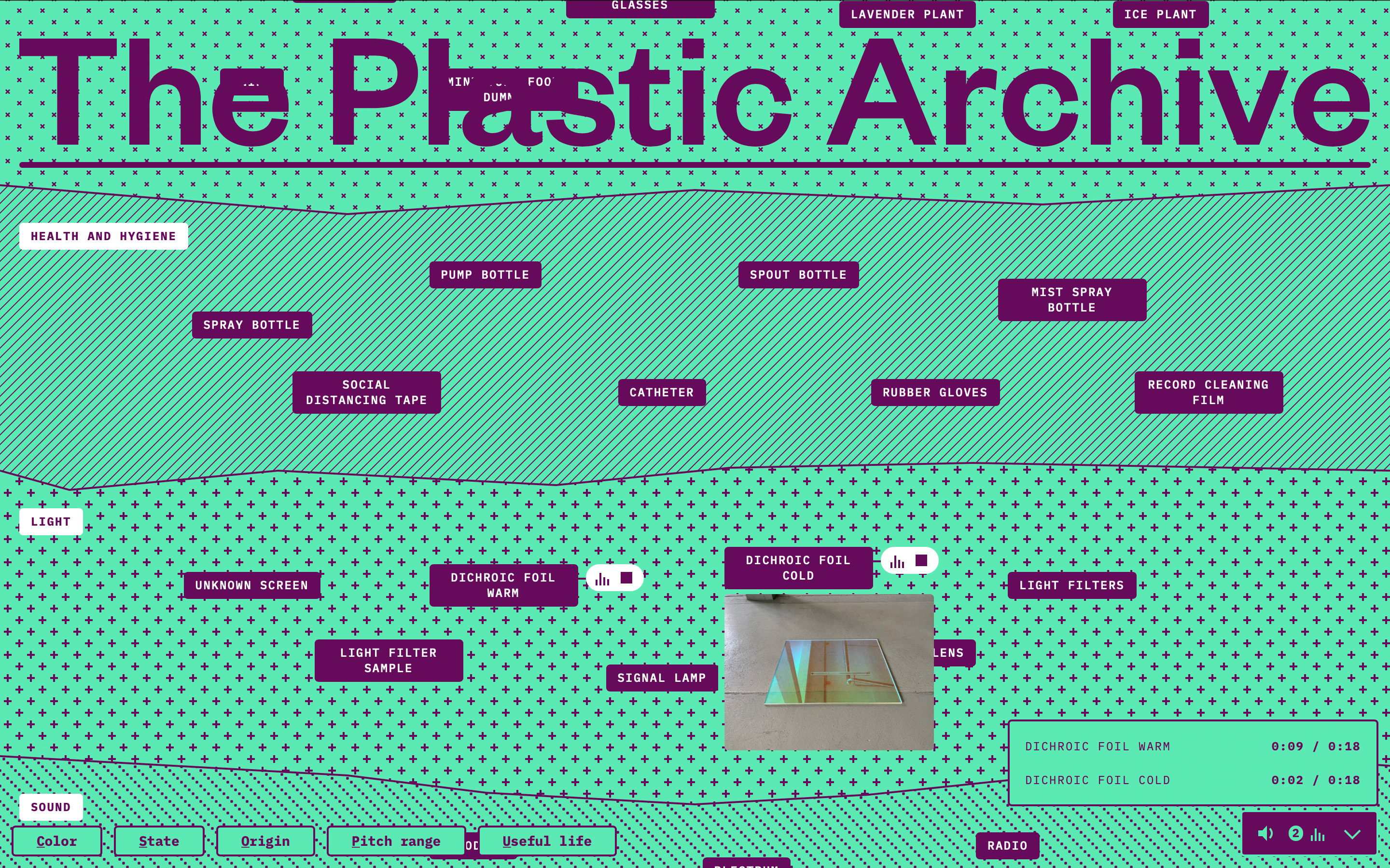 Gemeinsam mit den Künstler:innen Stine Hertel und Jan Rohwedder haben wir uns die Hände schmutzig gemacht um das physische Plastic Archive in virtuelle Sedimentschichten zu übersetzen. Das entstandene Designkonzept lehnt seine Ästhetik an die streng monochromen Interfaces längst obsoleter Betriebssysteme und den einfarbigen Druck geografischer Lehrbücher an. Eine markante Eigenschaft synthetischer Materialien ist die Möglichkeit ihnen nahezu jede Farbe geben zu können. So bringt jedes Objekt sein eigenes Farbschema mit, das sich über das gesamte Interface legt.