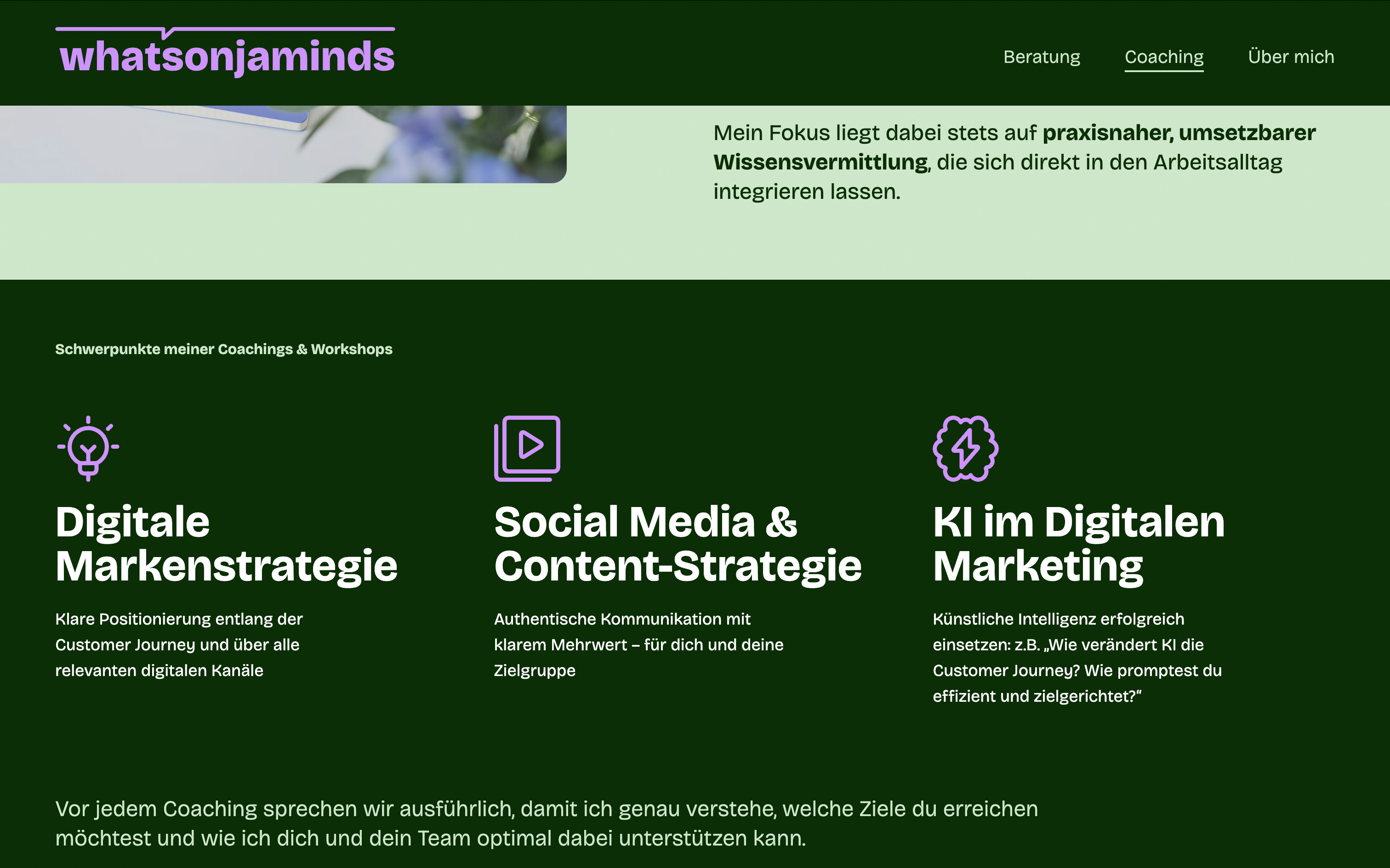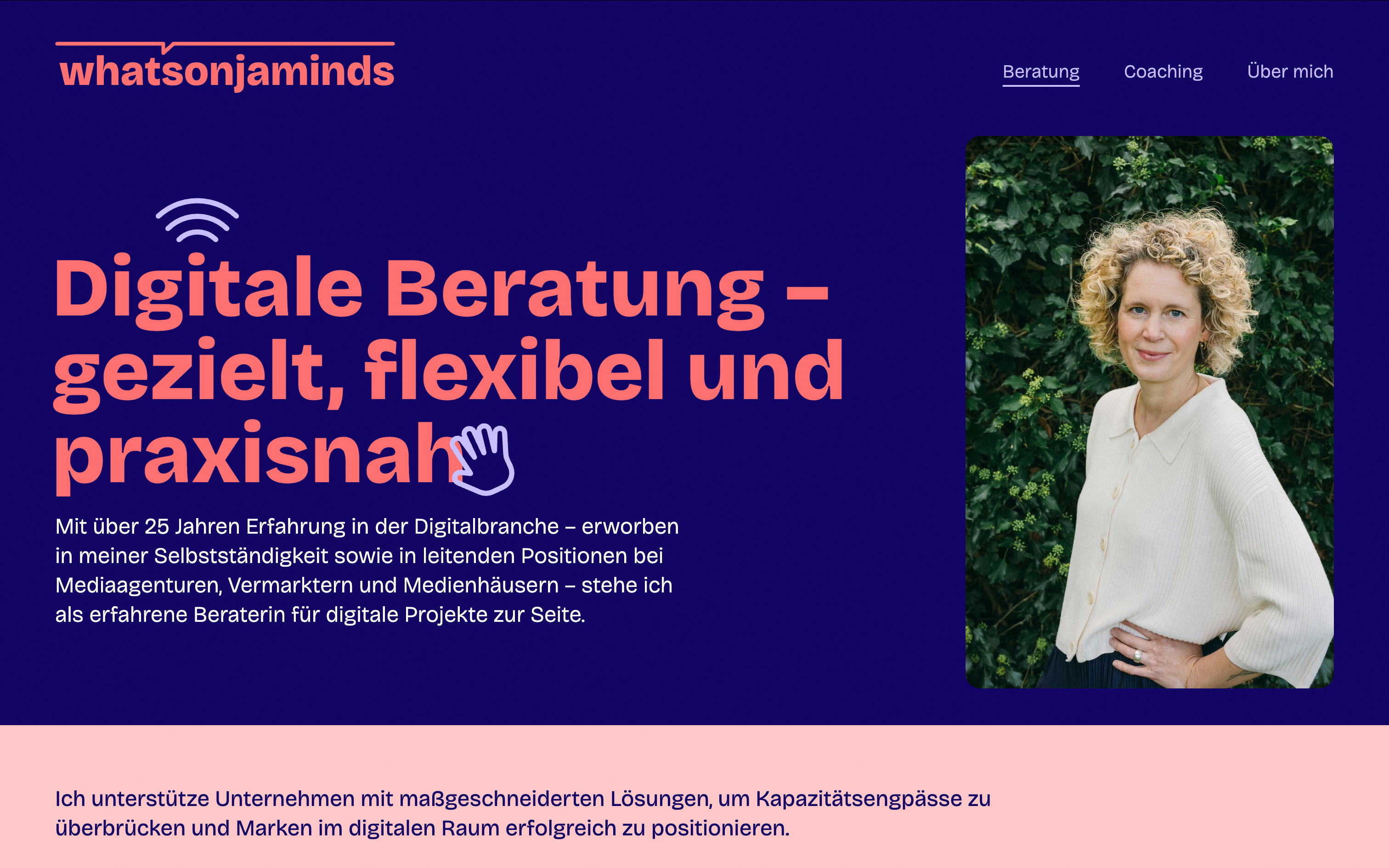 Für ihr Label whatsonjaminds haben wir ein klares, modernes Erscheinungsbild entwickelt, das die beiden Geschäftsbereiche Beratung und Coaching in jeweils eigenen Farbwelten kommuniziert. Verbunden durch klare Typografie und überdimensionierte Icons, die den Look mitbestimmen. Die Doppeldeutigkeit im Namen lösen wir durch eine kleine Logo-Animation auf, die beim Scrollen und anderen Interaktion immer mal wieder subtil auftaucht.